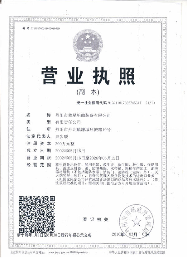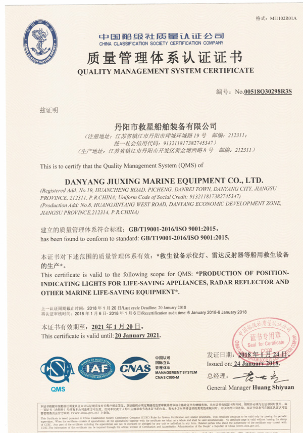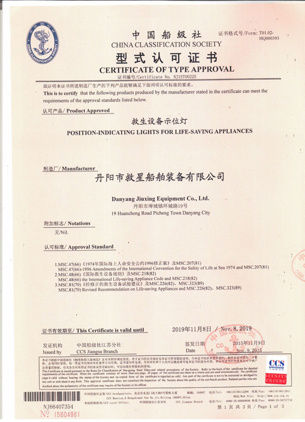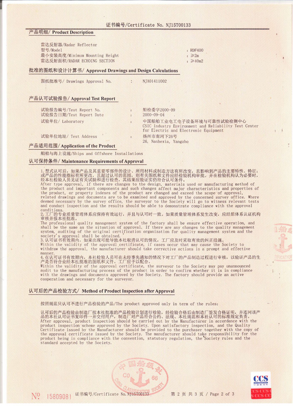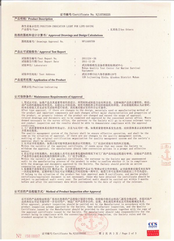 丹陽市救星船舶裝備有限公司為丹陽市船舶救生照明設(shè)備廠子公司,主要生產(chǎn)救生設(shè)備示位燈、雷達(dá)反射器、引航員軟梯、登乘梯等產(chǎn)品。其中救生設(shè)備示位燈采用國際上最先進(jìn)的科學(xué)技術(shù)、生產(chǎn)工藝,優(yōu)質(zhì)材料制造,各項(xiàng)技術(shù)指標(biāo)超過國際先進(jìn)水平,完全滿足國際最新標(biāo)準(zhǔn)。2012年元月取得“CCS”型式認(rèn)可證書,并具有歐共體“EC”證書。另外本公司制造的RDF400雷達(dá)反射器還獲得了實(shí)用新型專利。